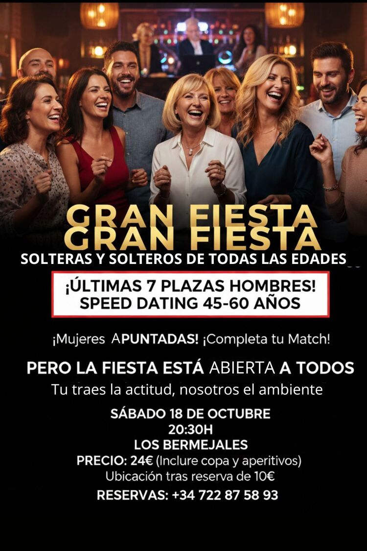 Hola, queda plaza para una mujer y para siete hombres. Pero recuerda que puedes ir a la fiesta sin participar de las citas, o incluso puedes decidirlo allí si quedan plazas, vente a pasarlo bien, escríbeme y reserva tu plaza con un bizum